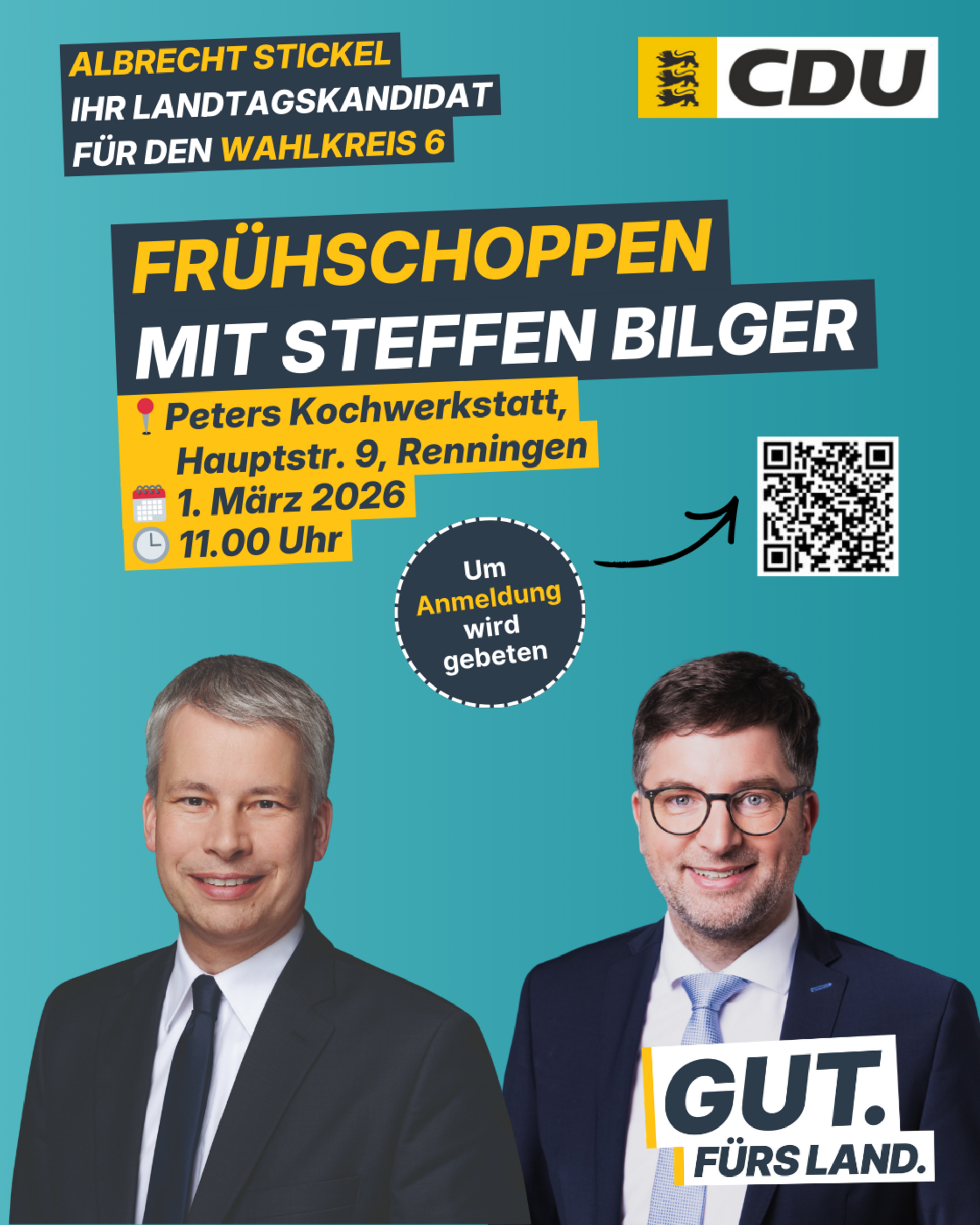 Um die Bewirtung vorzubereiten, bitten wir um Anmeldung über den QR-Code oder per Mail an team@albrecht-stickel.de, damit wir besser kalkulieren können.